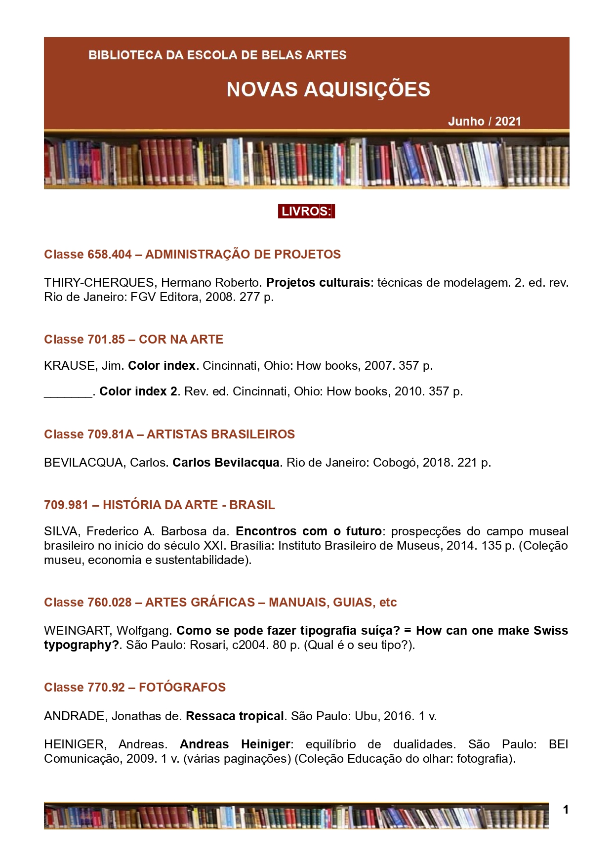 Postagens Novas aquisições Junho/2021 8 de julho de 2021 bibliobelas Deixe um comentário Clique na imagem para baixar, na íntegra, o Boletim de Novas Aquisições do mês de junho de 2021: Novas Aquisições – Junho / 2021