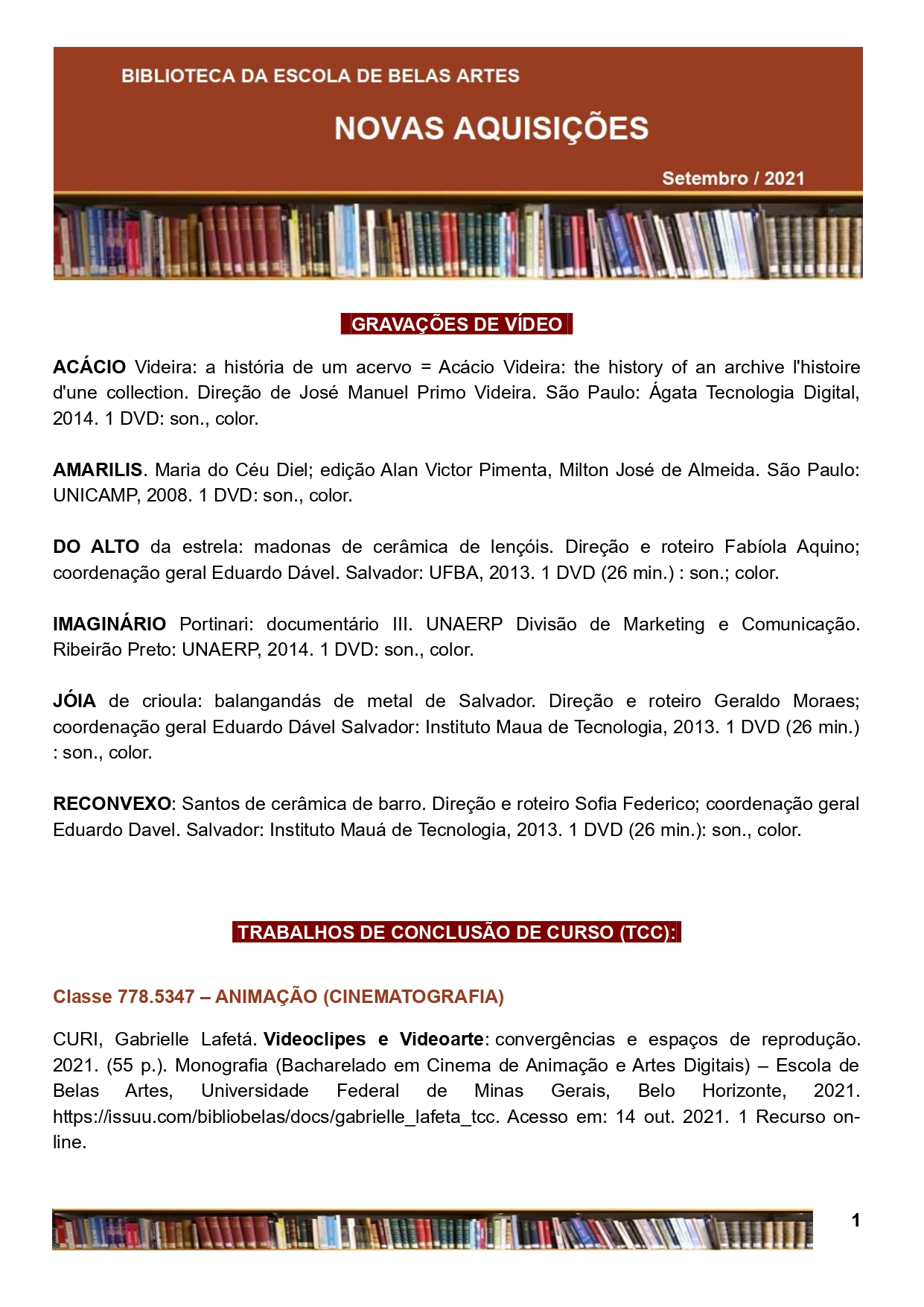 Postagens Novas aquisições Setembro/2021 15 de outubro de 2021 bibliobelas Deixe um comentário Clique na imagem a seguir para baixar, na íntegra, o Boletim de Novas Aquisições do mês de setembro de 2021: Novas aquisições Setembro/2021