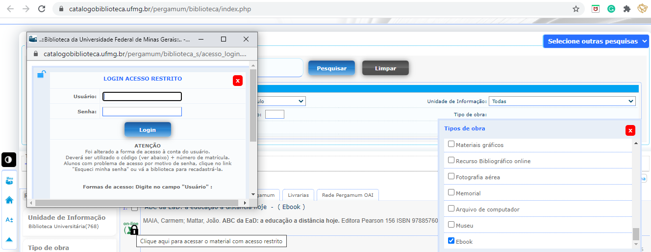 Primeiro acesso às plataformas é feito via catálogo on-line, clicando no cadeado ao lado da obra pesquisada e preenchendo as informações solicitadas