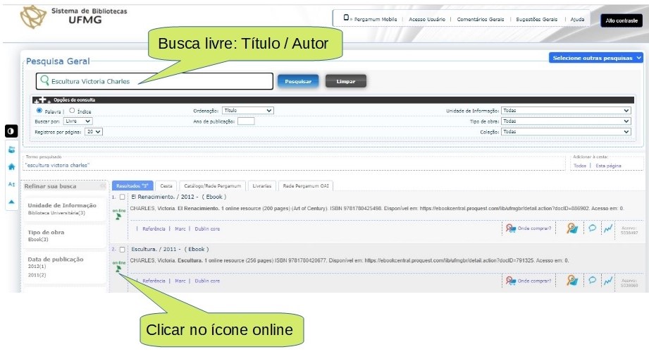 1) Através do Catálogo do Sistema Pergamum. O usuário realizará a busca e localização do livro, como de costume. Em seguida, deverá clicar no ícone online (de cor verde) do acervo desejado e realizar a autenticação no site da Proquest. O redirecionamento será feito de forma automática para o acesso ao livro na íntegra! Veja o exemplo abaixo:
