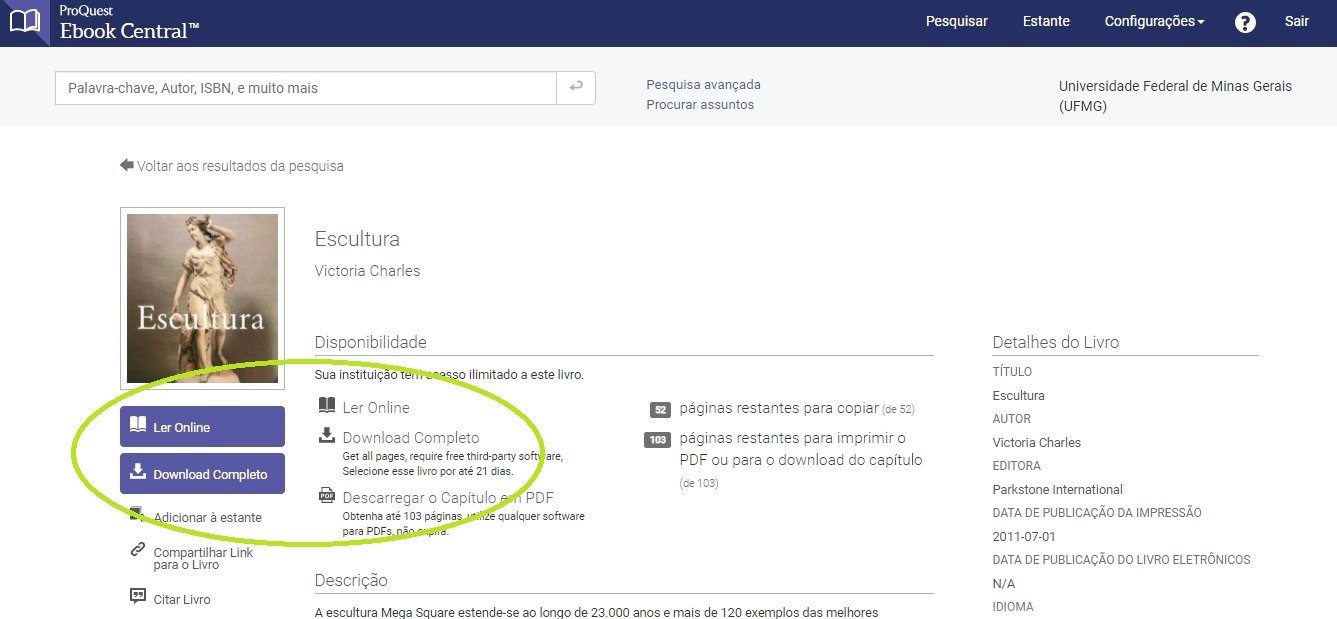 - O usuário deverá realizar a autenticação pelo link exclusivo da UFMG: https://ebookcentral.proquest.com/lib/ufmgbr/home.action