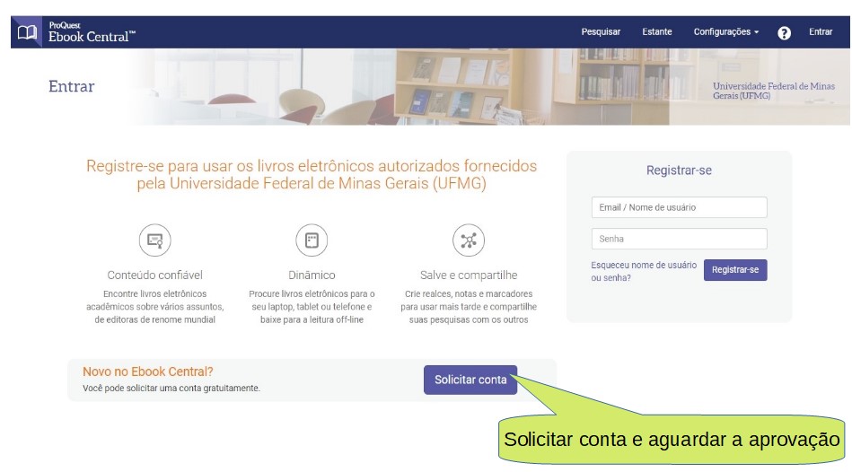 Para acessar a plataforma, é necessário clicar em ‘solicitar conta’ no link https://ebookcentral.proquest.com/lib/ufmgbr, preencher o formulário de solicitação e aguardar aprovação.
