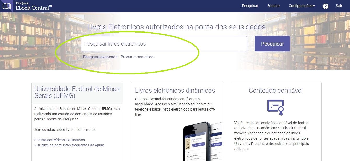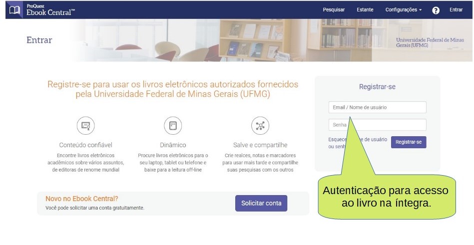 - O usuário deverá realizar a autenticação pelo link exclusivo da UFMG: https://ebookcentral.proquest.com/lib/ufmgbr/home.action