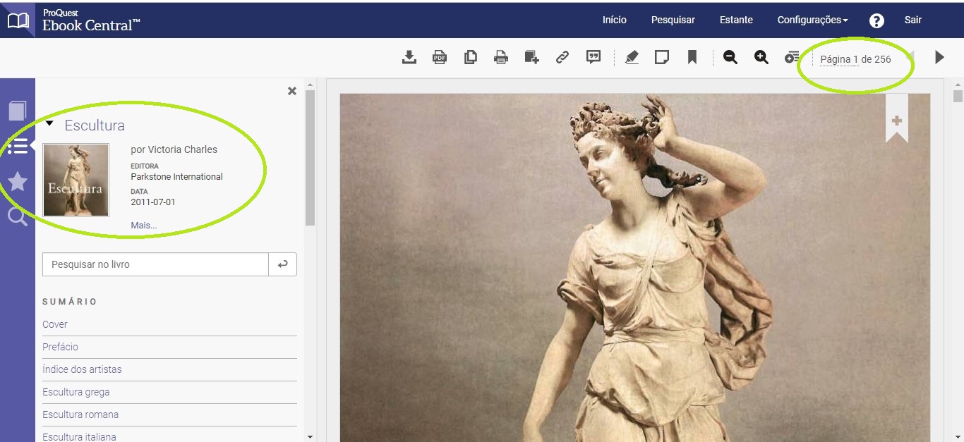 1) Através do Catálogo do Sistema Pergamum. O usuário realizará a busca e localização do livro, como de costume. Em seguida, deverá clicar no ícone online (de cor verde) do acervo desejado e realizar a autenticação no site da Proquest. O redirecionamento será feito de forma automática para o acesso ao livro na íntegra! Veja o exemplo abaixo: