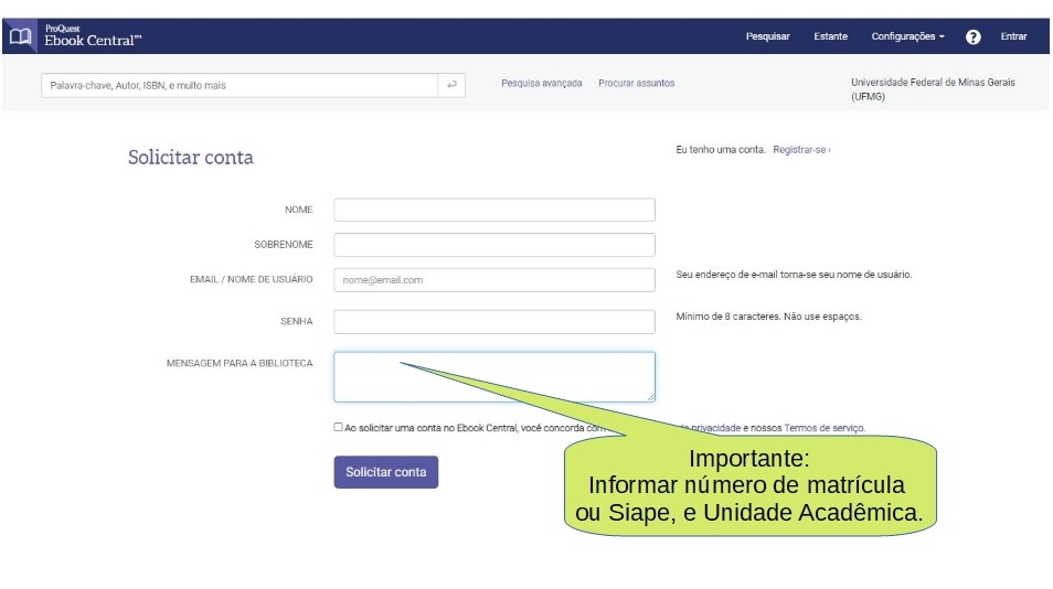 Para acessar a plataforma, é necessário clicar em ‘solicitar conta’ no link https://ebookcentral.proquest.com/lib/ufmgbr, preencher o formulário de solicitação e aguardar aprovação.